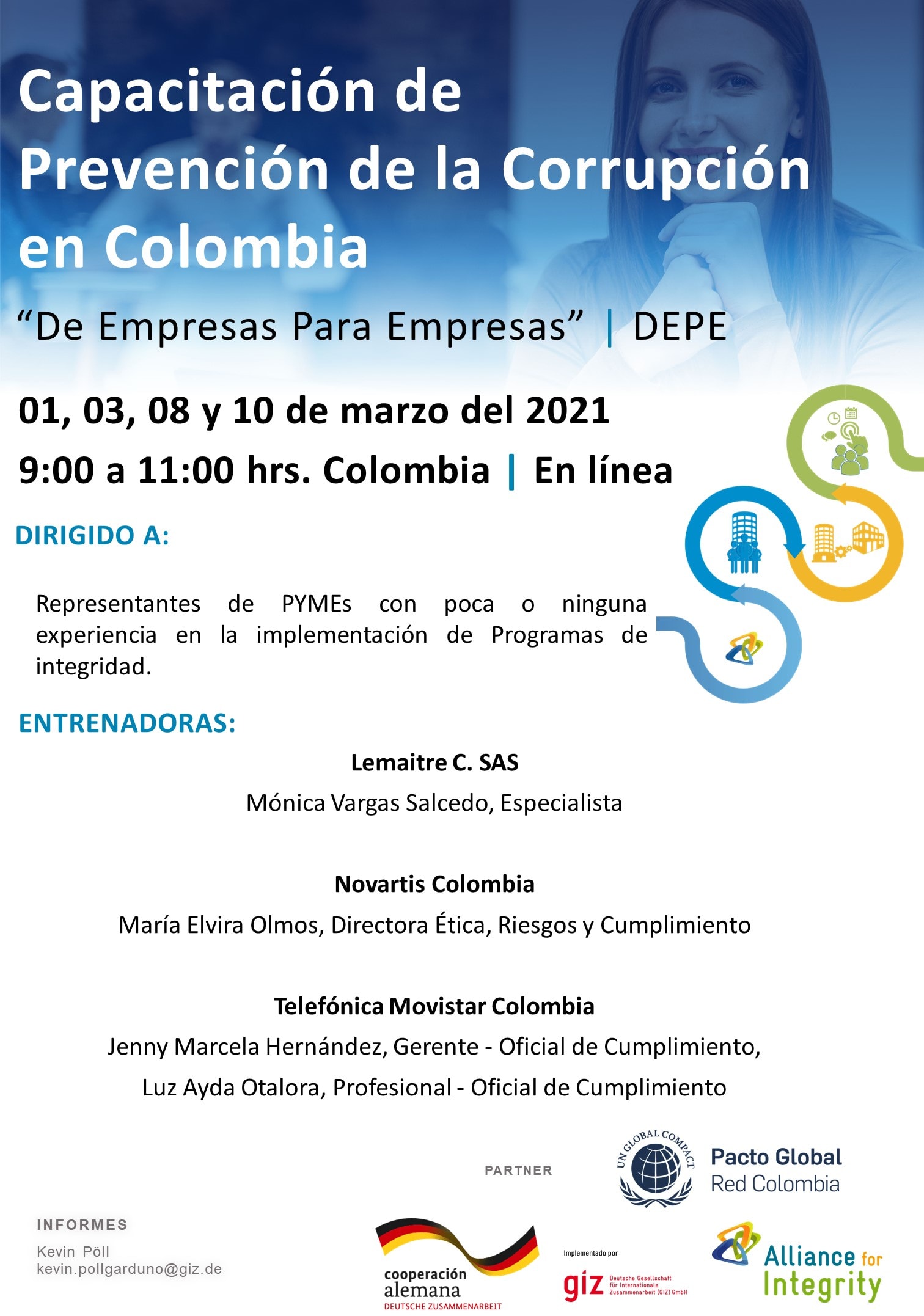 El público principal de esta capacitación son representantes de PyMEs colombianas con poca o ninguna experiencia en la implementación de sistemas efectivos de prevención de la corrupción. La participación también está abierta a representantes de otras organizaciones interesados en aprender acerca de definiciones, factores de riesgo y soluciones potenciales en el área de la integridad de negocios.